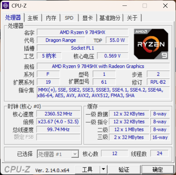 首先是处理器。锐龙9 7845HX隶属于锐龙7000系列,基于Zen4架构。其拥有12核心24线程,基准频率3GHz,最大加速频率5.2GHz,三级缓存64MB,TDP为55W。
