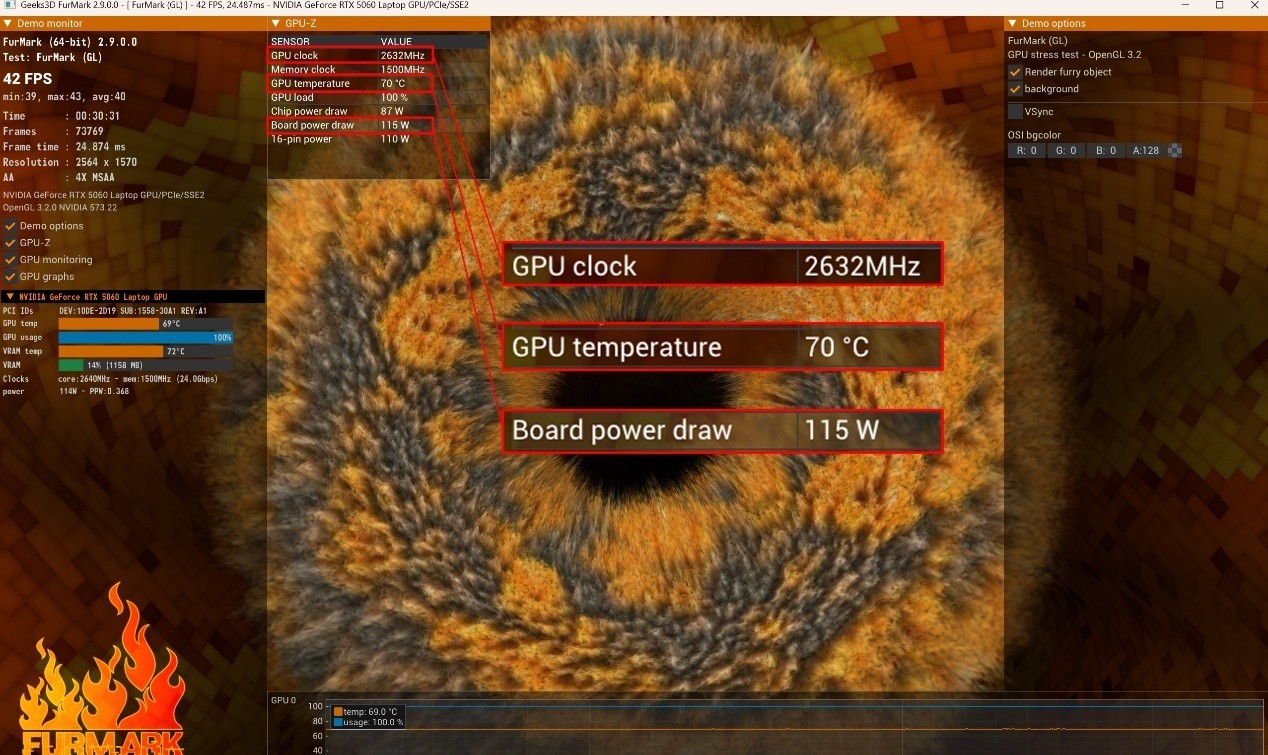 30分钟压力测试,RTX 5060 Laptop的功耗稳定在115W左右,妥妥满血表现,此时的核心频率稳定在2632MHz,核心温度只有70℃,偏低。可见COLORFIRE MEOW R16 Pro的散热能力很强劲。