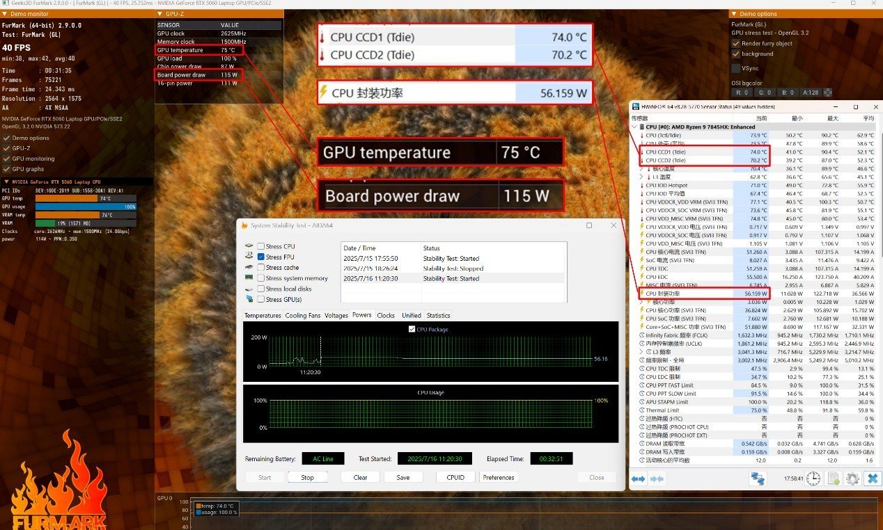 双烤30分钟,锐龙9 7845HX的功耗稳定在56W左右,此时CCD1核心温度在74℃左右,CCD2核心温度在70℃左右;RTX 5060 Laptop的功耗稳定在115W左右,核心温度稳定在75℃左右。COLORFIRE MEOW R16 Pro的整机性能释放能够达到170W,表现不输售价七千的游戏本。而且两个核心的温度控制在了75℃以内,散热表现十分强劲。