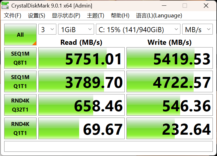 存储方面,COLORFIRE MEOW R16 Pro搭载了16GB DDR5 5200MHz内存(内存最高频率为5600MHz,受处理器影响,运行在5200MHz)和1TB PCIe4.0固态硬盘,是比较常见的存储搭配。固态硬盘的性能表现比较亮眼,实测持续读取5751.01MB/s、持续写入5419.53MB/s;4K随机读取69.67MB/s、4K随机写入232.64MB/s,表现出色,属于PCIe4.0固态硬盘的高端水平。