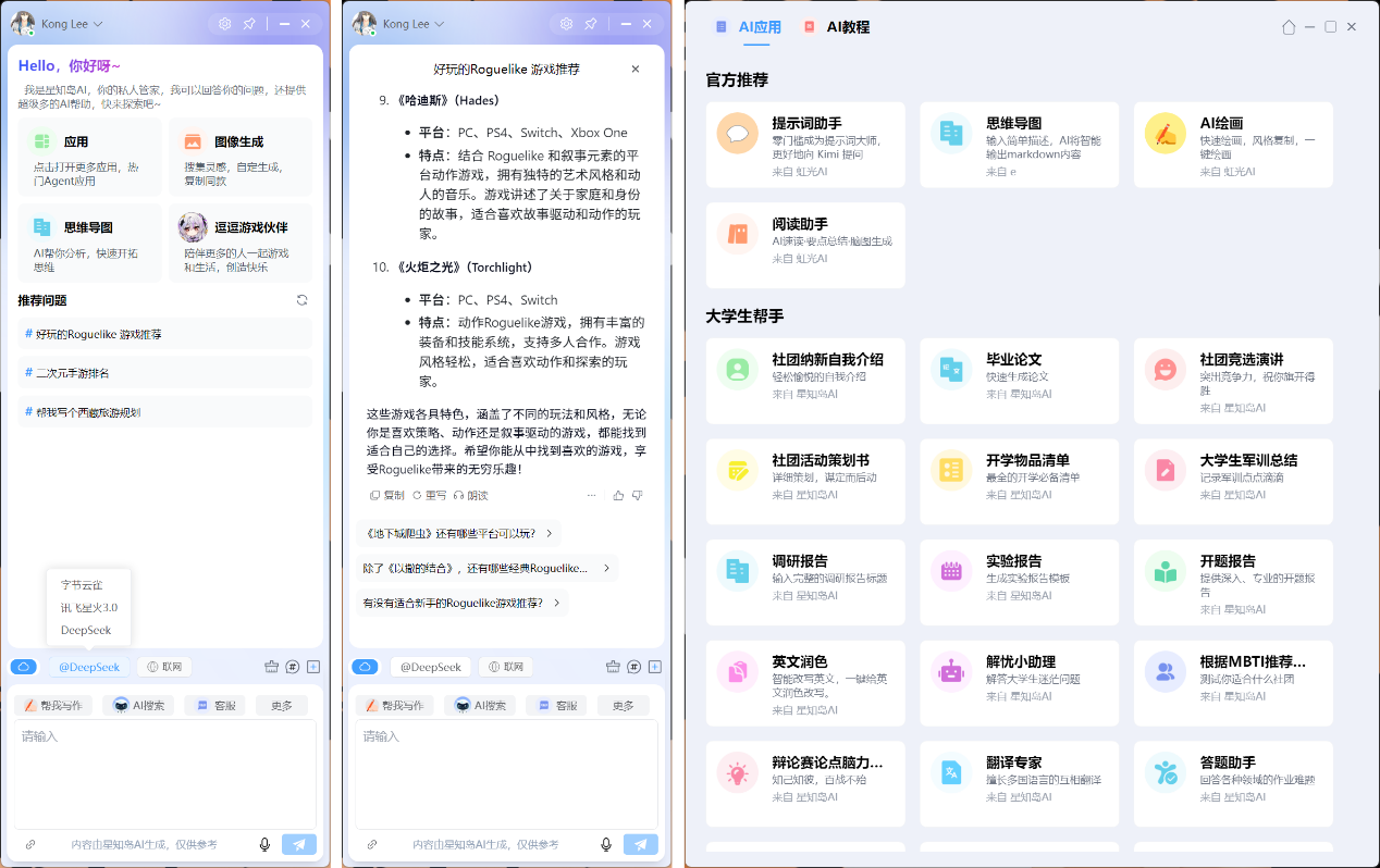 星知岛最好用的一点就要数集成云端大语言模型,包括DeepSeek、讯飞星火3.0、字节云雀等,同时支持联网搜索功能。实测响应速度极快,而且几乎很难遇到“服务器繁忙,请稍后再试”的情况。此外还有鼠标一键划词功能、免费AI教程专区及图像生成等功能,最新升级的“AI阅读助手”,还可以快速阅读总结各类PDF文档。