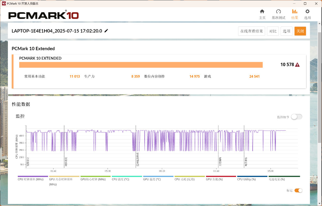 整机性能方面,使用PCMARK 10 Extreme进行测试,得到总分10578。其中常用基本功能为11013、生产力为8359、数位内容创作为14975、游戏为24541。从各项成绩来看,COLORFIRE MEOW R16 Pro有着优异的游戏性能,同时在创作方面也有着不俗的能力。
