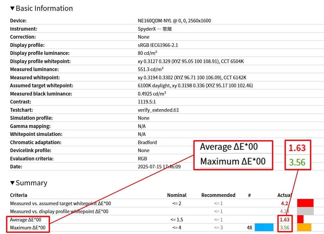 色准方面,官方并没有公布数据,不过实测数据还不错,sRGB下的平均色准只有1.63,最大值为3.56,表现超出预期,部分创作工作也能应对。