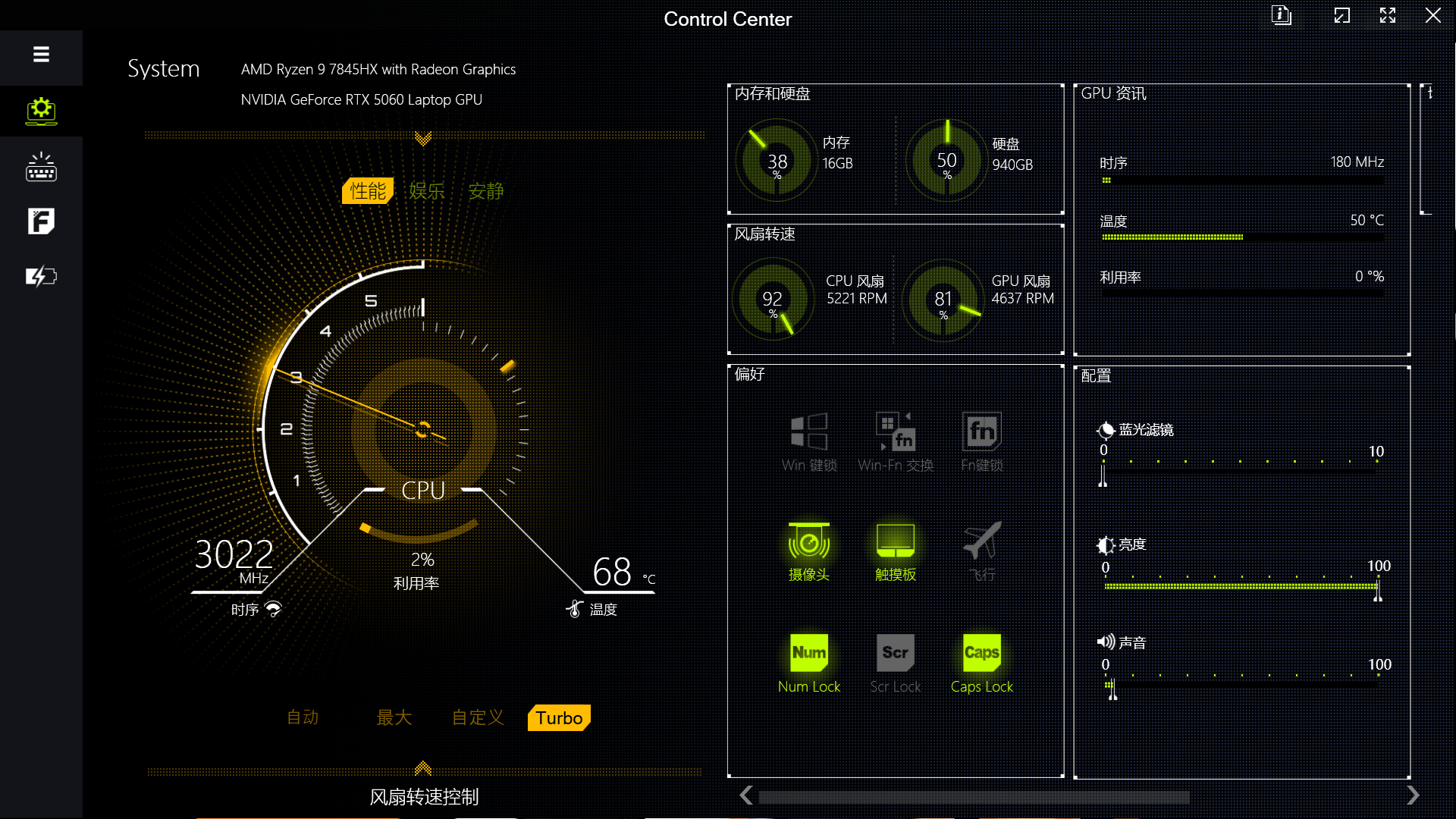 软件层面,COLORFIRE MEOW R16 Pro预装了Control Center,用户可以选择不同的性能模式和风扇模式,监控硬件使用情况,以及系统功能的快捷实现。此外,像独显直连、键盘背光等功能,同样集成于此,方便用户设置。