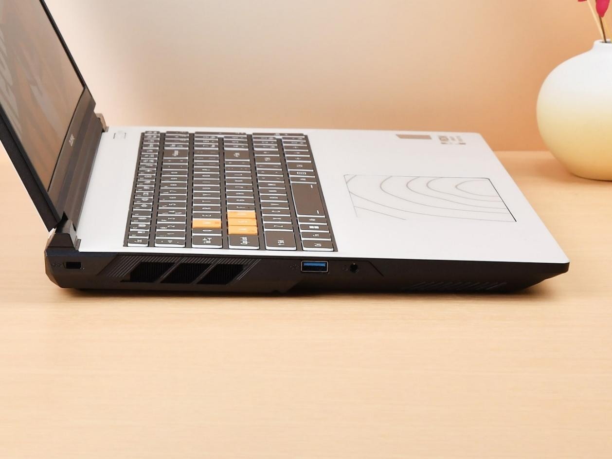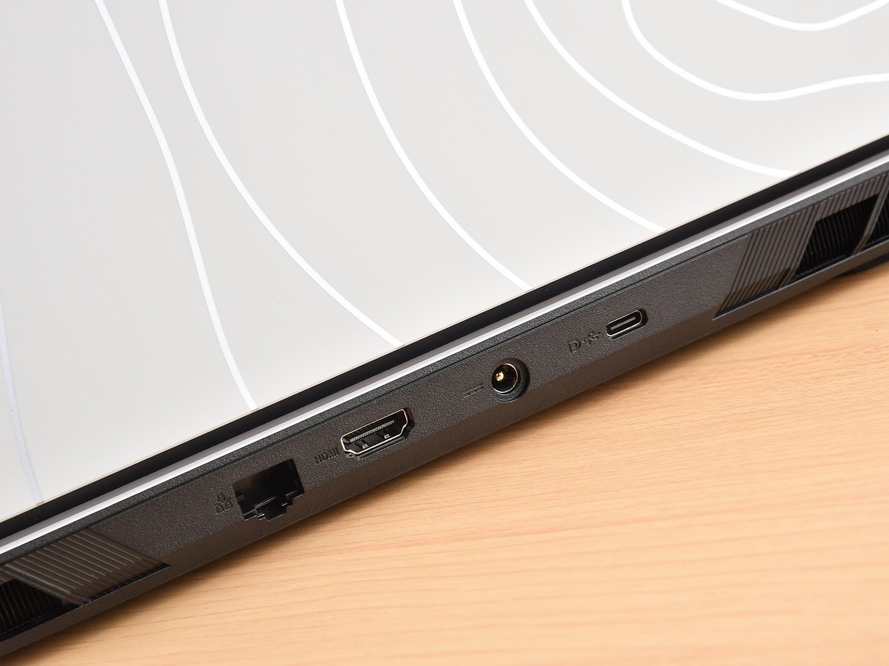 接口主要集中在机身的两侧和后侧,其中左侧为USB 3.2 Gen 1(Type-A)、3.5mm音频口;右侧为USB 3.2 Gen 2(Type-C,支持DP+充电)、USB 3.2 Gen 2(Type-A);后侧为RJ45(千兆)、HDMI、电源接口和右侧为USB 3.2 Gen 2(Type-C,支持DP)。接口数量属于游戏本的主流水平,连接外设比较方便。