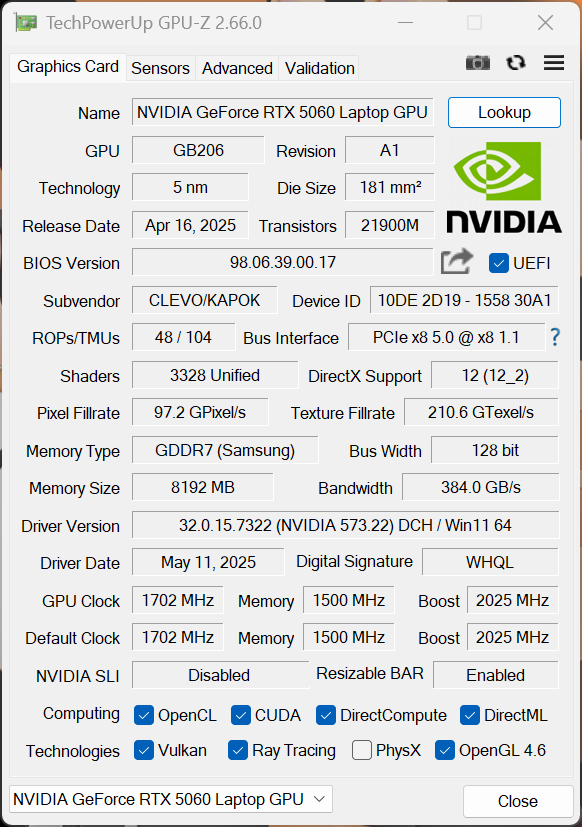 其次是显卡。RTX 5060 Laptop是一款关注度比较高的显卡,它采用最新Blackwell架构,拥有3328个CUDA核心,默认频率1702MHz,Boost频率2025MHz;现存为8GB GDDR7,来自三星,显存位宽128bit,显存频率1500MHz。COLORFIRE MEOW R16 Pro搭载的为115W满功耗版本。