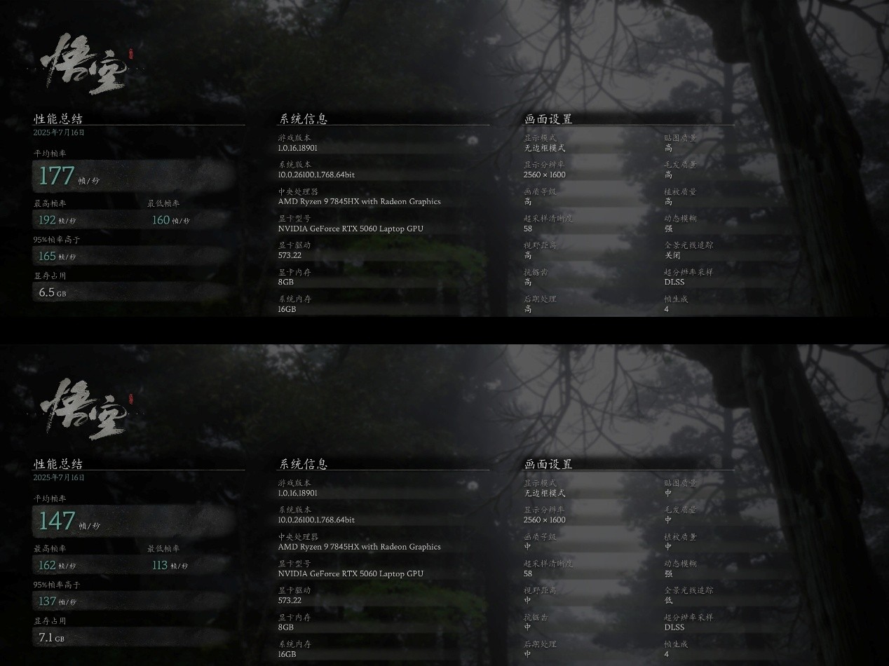 《黑神话:悟空》测试了两个画质模式,均在DLSS均衡、4倍多帧生成下进行。在预设高画质+关闭全景光线追踪下,游戏的平均帧率为177帧/秒,流畅度完全没有问题。在预设中画质+全景光线追踪低下,游戏的平均帧率为147帧/秒,流畅度也不错。想要平衡画质和帧数,还是更推荐高画质+关闭全景光线追踪。