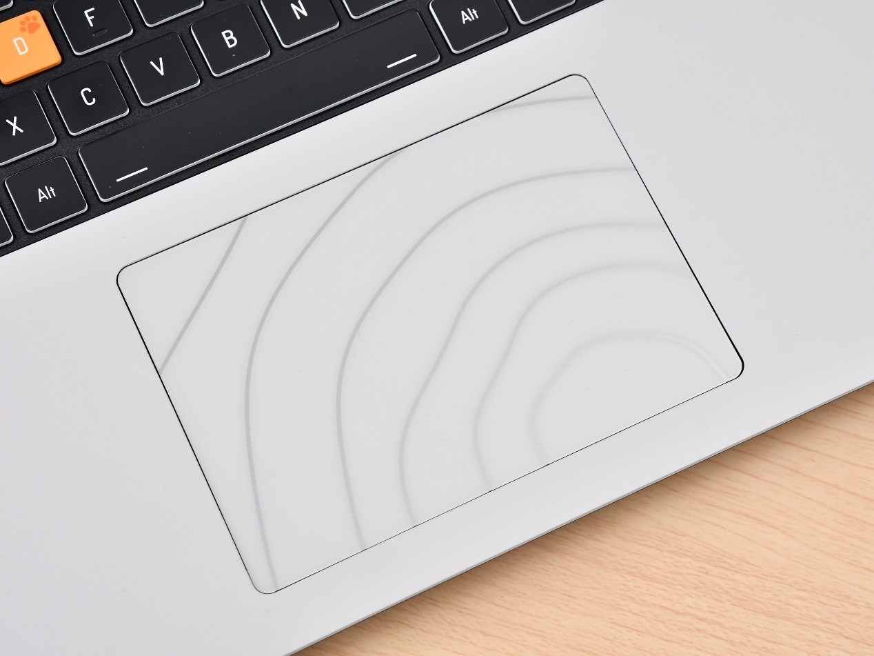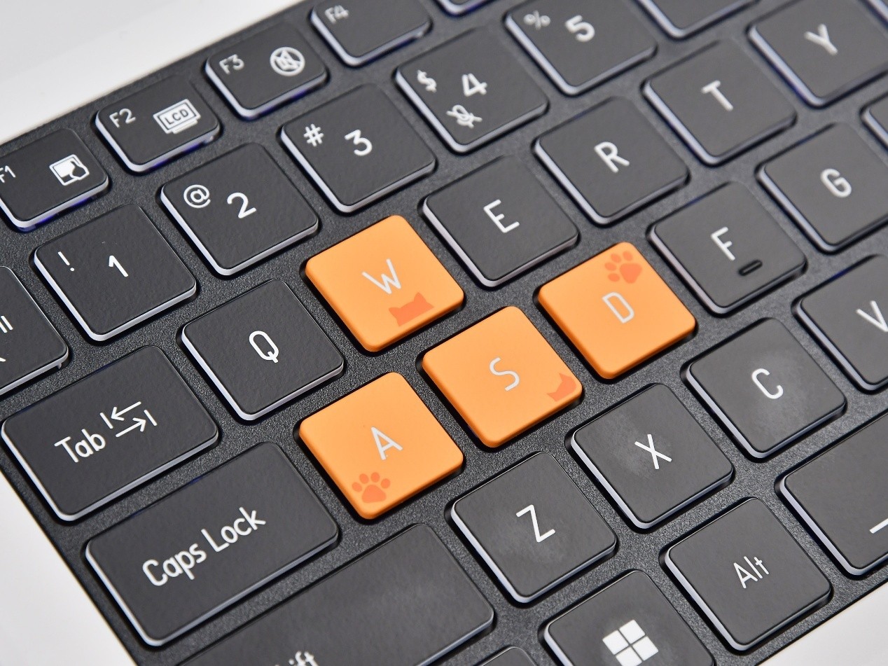 C面右小角也有类似设计,为MEOW灰白丝印。C面吸引眼睛的就要数橙色的WASD定制猫猫键帽,或有猫爪印,或有猫耳印,非常可爱。触控板的表面也有漫画般的涟漪圆圈,与A面遥相呼应。