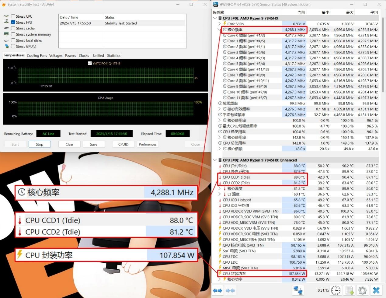 30分钟压力测试,锐龙9 7845HX的封装功耗稳定在108W左右,非常给力。此时处理器的全核频率稳定在4.3GHz左右,CCD1的温度在88℃左右,CCD2的温度在81℃左右。处理器的性能释放非常强劲,很亮眼。