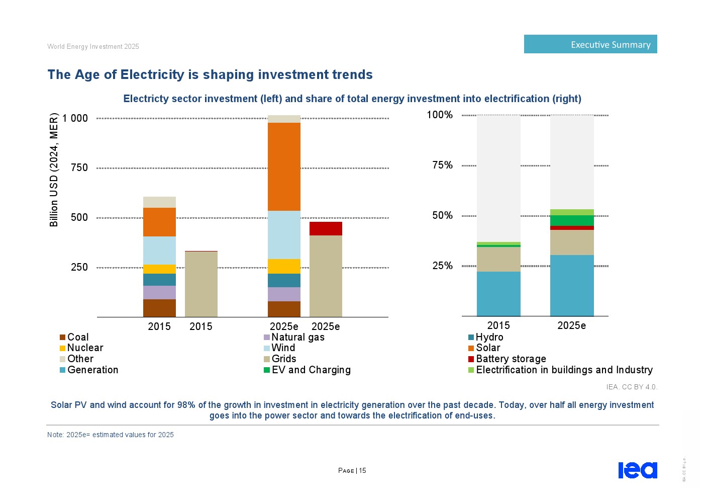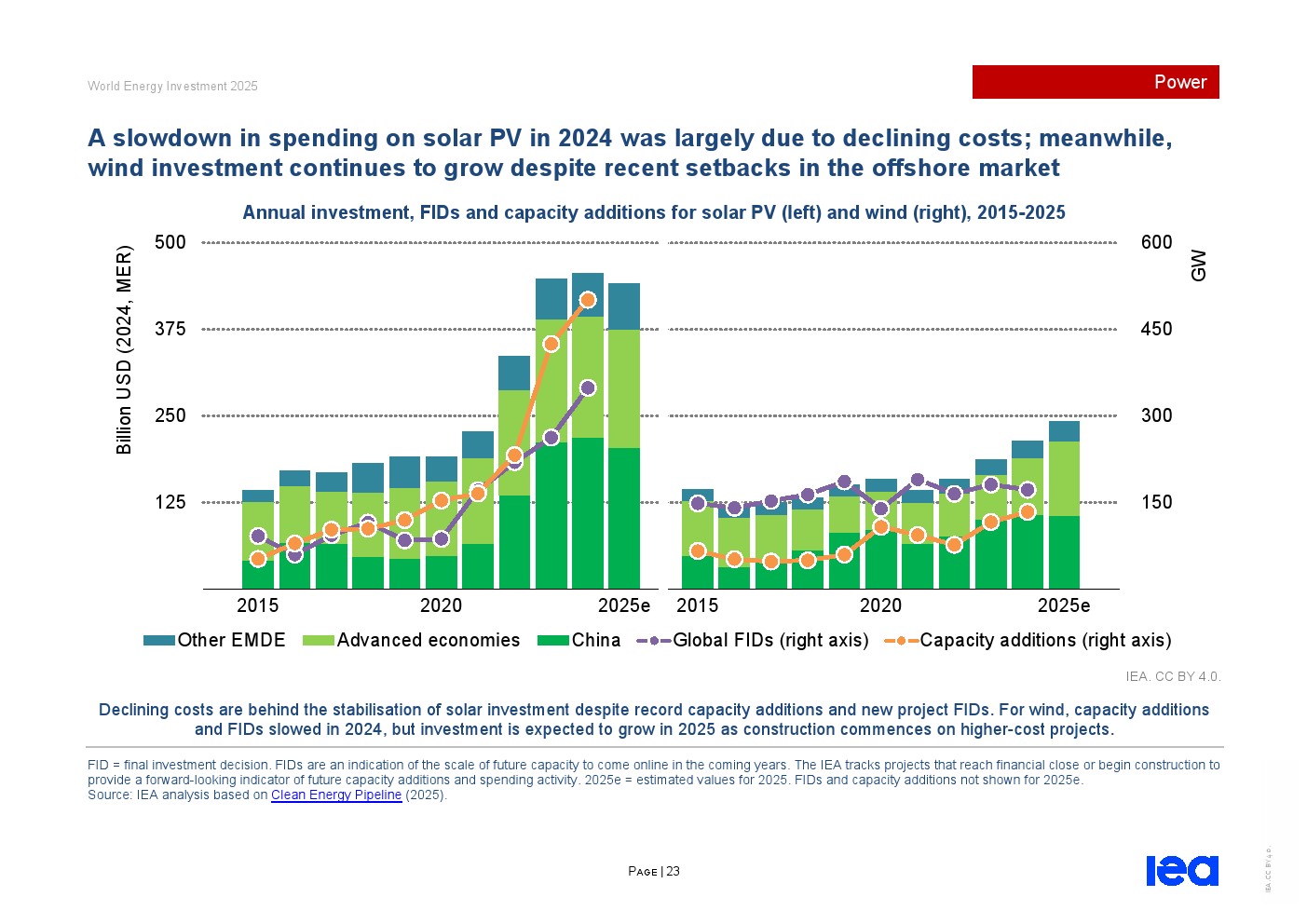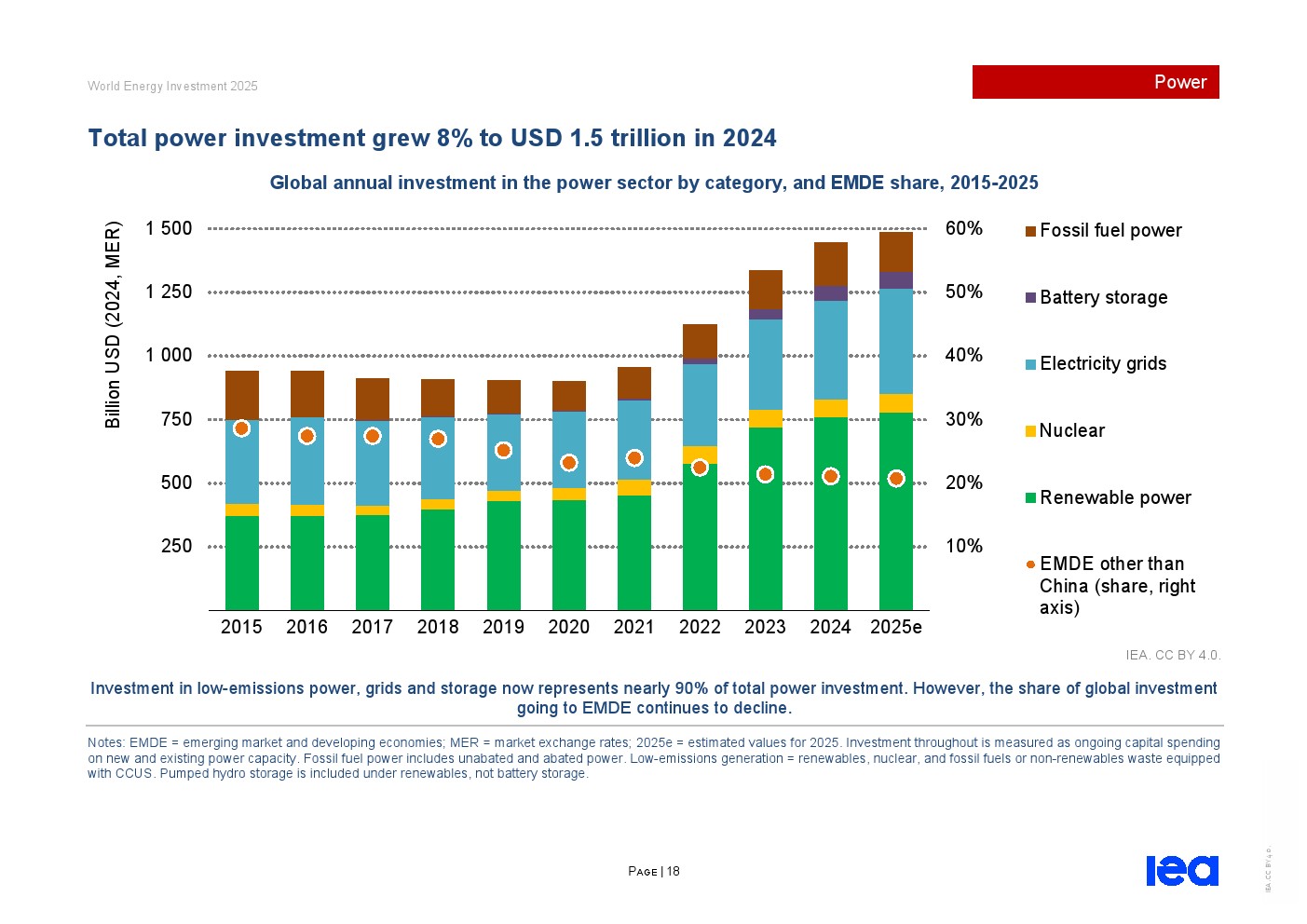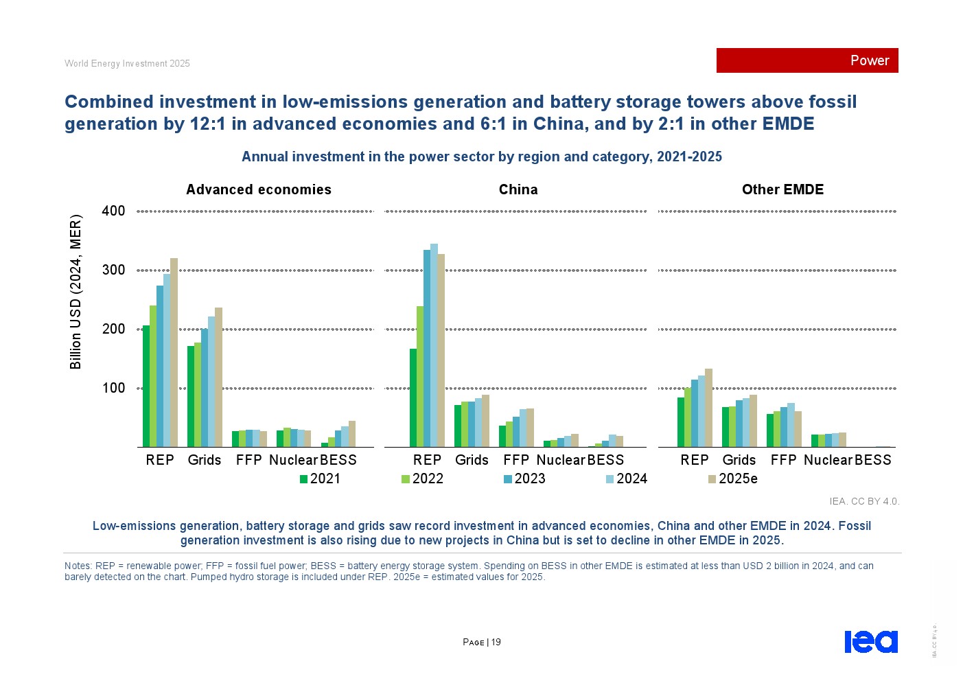 过去五年低排放发电支出增长近一倍,其中太阳能光伏引领发展。