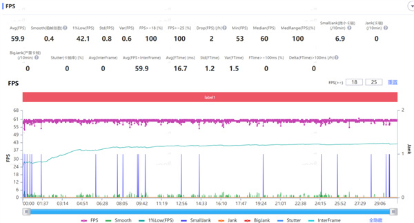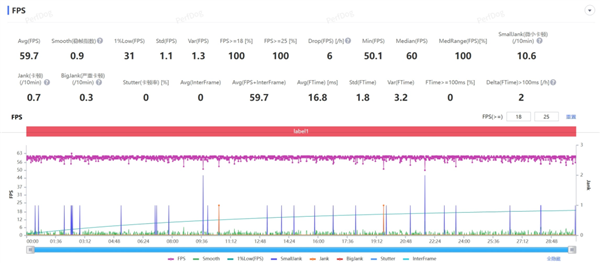 我们直接给大家测了个须弥城,风扇全开的情况下,帧率还是很稳定的,根据 Perfdog 的记录,半小时下来平均帧率 59.7 帧,跟我们之前测试的红米 Turbo 4 Pro 差不多。