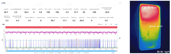 帧率开始波动了!半小时测下来平均帧率 59 帧,机身最高温度出现在背面的风扇进风口,有 49.5 度。