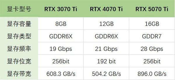 显存带宽是由显存频率和显存位宽综合决定的,表示显示芯片与显存之间的数据传输速率,比如RTX 4070 Ti,虽然显存容量和显存频率都有升级,但是显存位宽降至192 bit,使得显存带宽不如RTX 3070 Ti。当然,因为其他方面的碾压,所以RTX 4070 Ti的整体性能表现还是更优的。