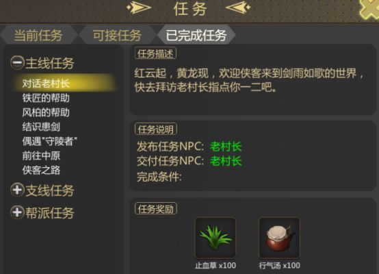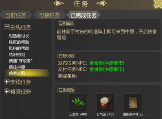 2、铁匠会给予帮助,除赠送100药材外,还会送出一套新手武器;3、风柏也会提供协助,除100药材外,还有一套新手服饰;4、结识患剑任务,击败三只新手熊后可获得100药材;5、偶遇守陵者,击杀三名新手忍者后也可得到100药材;6、前往中原寻找周无相,可获得100药材及一张前往中原的船票;7、踏上侠客之路,在中原找到金食堂,可得400药材与一本武功残卷雷雨犀牛林。