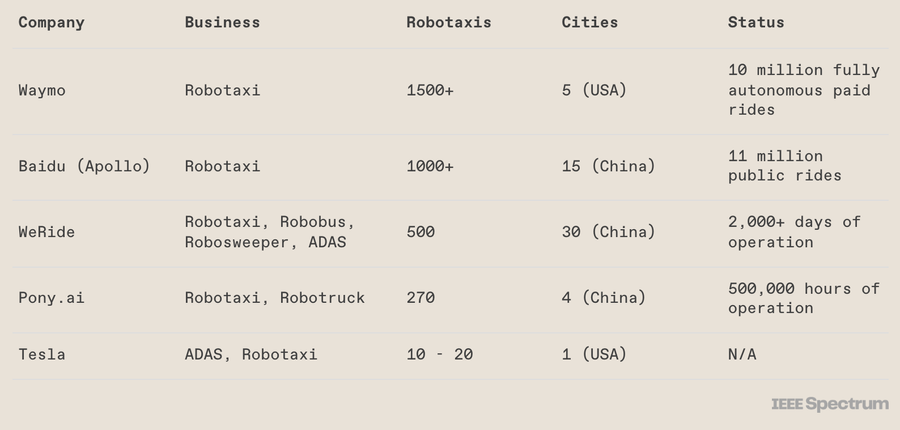 虽然 Waymo 开创了机器人出租车的先河,但几乎所有其他提供常规公共道路服务的公司都是中国公司。它反映了全球电动汽车市场,除了特斯拉之外,比亚迪等中国汽车制造商也占据了顶端。