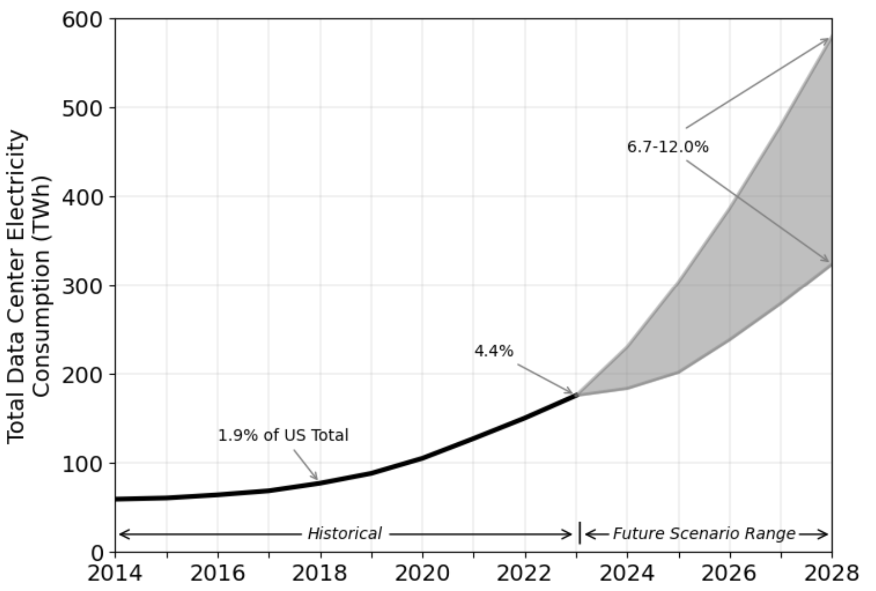 图 1:2014 年至 2028 年总发电量与服务器存储、网络设备和基础设施消耗量(估计)。资料来源:劳伦斯伯克利国家实验室报告[1]