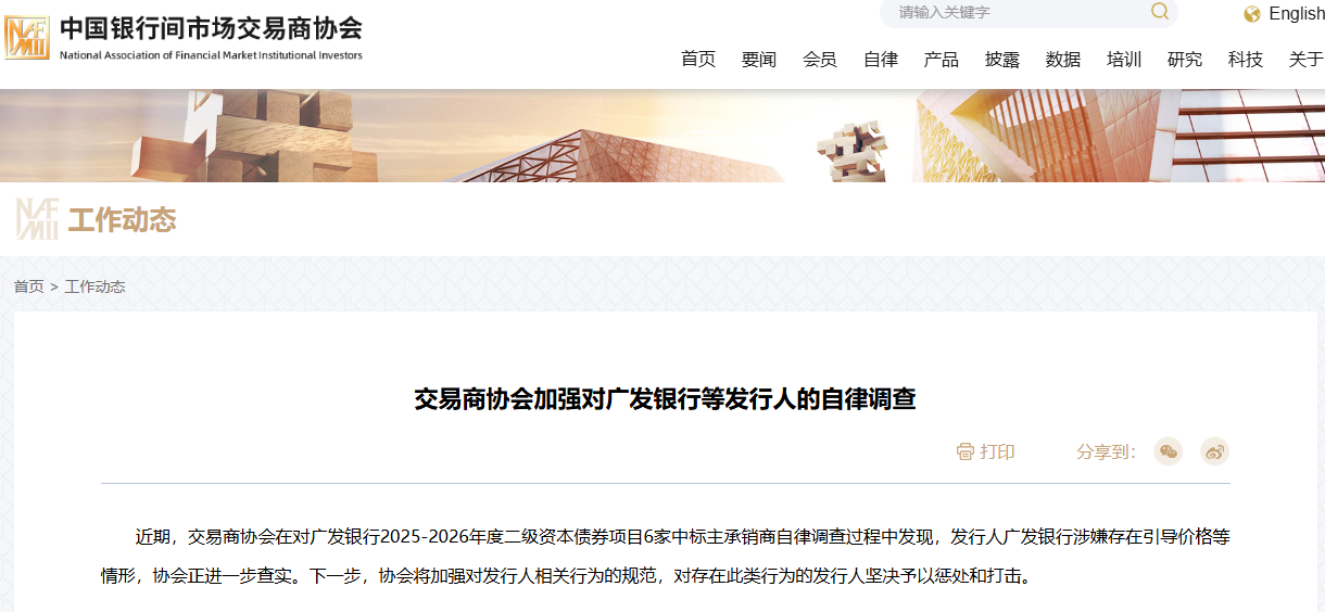 7月21日,中国银行间市场交易商协会(下称“交易商协会”)发布最新公告称,在调查过程中发现,发行人广发银行涉嫌存在引导报价行为,协会正进一步查实,下一步将加强对发行人相关行为的规范,对存在此类行为的发行人坚决予以惩处和打击。此前,交易商协会已对6家主承销商启动自律调查。