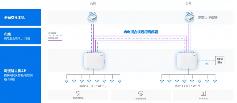 医院环境的网络需求远超普通商业场景。当医生使用PDA查房、护士操作移动护理车时,终端在不同AP间频繁切换,需重新建立连接,平均耗时数百毫秒,连续高延时可能导致数据丢包。采用传统馈线方案部署,高带宽业务承载力不足;采用面板式AP方案,设备数量激增,管理复杂度呈指数级增长。其次,医院信息等保合规是智慧医院建设不可或缺的一部分。传统方案需部署三套独立网络,往往伴随着更高的建设成本与运维负担。随着智慧医院的建设推进,物联网应用日益普及,如无感采集、跌倒预警等。医院网络需能灵活拓展,支撑业务弹性发展,同时降低建网成本。这些诉求,正是锐捷新一代医疗全院零漫游解决方案诞生的初衷。