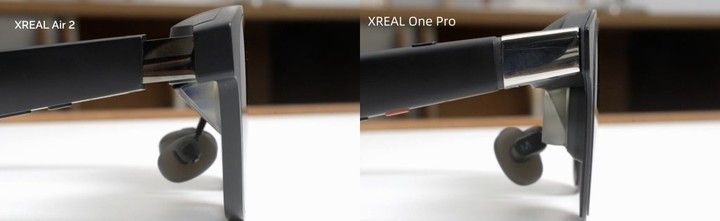 先看看外观方面,对比上一代的 XREAL Air 2 系列,XREAL One Pro 搭载了全新设计的 X-Prism 光机,镜片和镜框都要更小更薄,也更贴脸,戴在头上也要更像一副普通的太阳镜。
