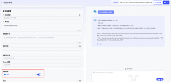 5、原生支持联网检索:用户在创建智能体的过程中,无需额外安装工具插件,即可使用联网检索服务。支持用户从百亿级网页中获取知识,涵盖天气、新闻、百科等,提升智能体响应效果。