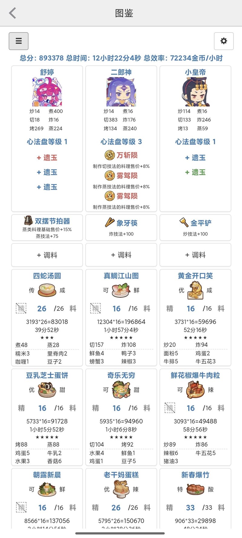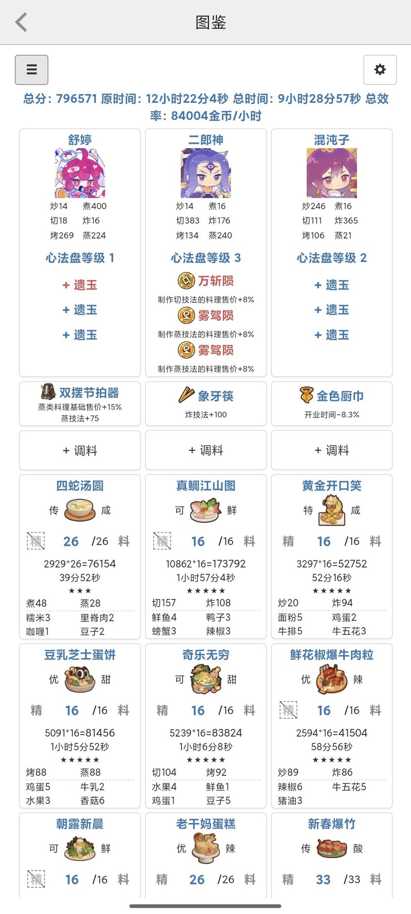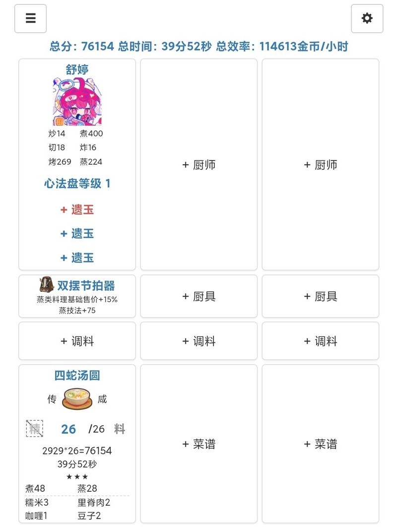 计算刷金币方案时,建议先选择菜品,再匹配厨师。点击添加菜谱后,系统会按效率自动排序,可根据食材情况选择合适的菜谱。如果拥有特别强力的厨师,例如五星修炼厨师或加成较高的厨师,也可以尝试先选厨师再配菜品。