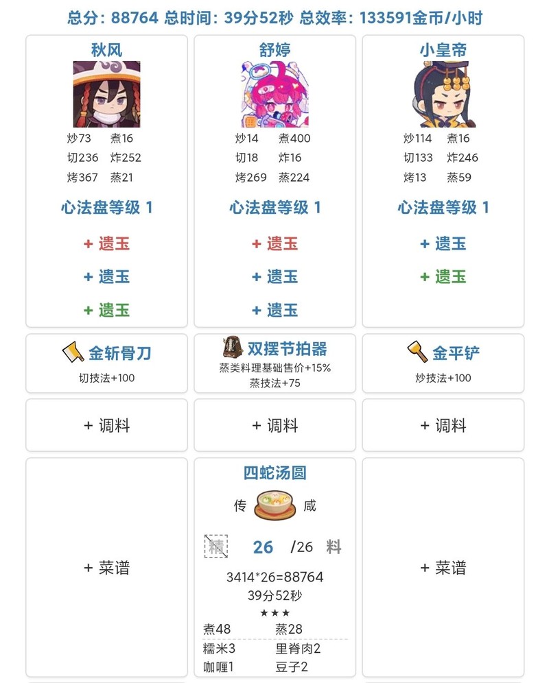 有些厨师擅长做一道菜,但未必能同时做好三道。可以先做菜再调整厨房安排,或先优化厨房再做菜,多试几次,找到最佳方案。最后附上两个自用的方案参考。