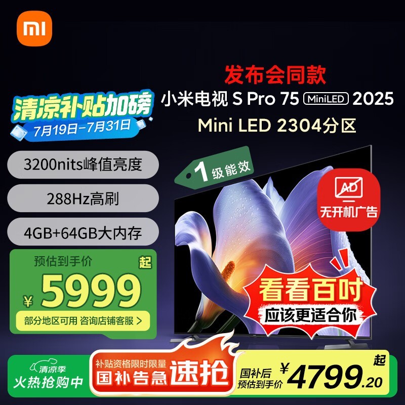 小米S Pro 2025 75英寸Mini LED电视钜惠