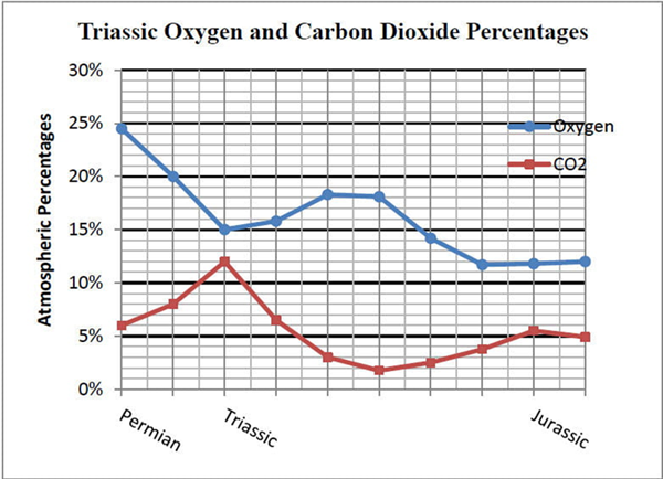 图中的蓝色线条为三叠纪到侏罗纪时期的氧气含量波动。可见从三叠纪到侏罗纪,氧气含量远低于现代。图源:bioprinciples.biosci