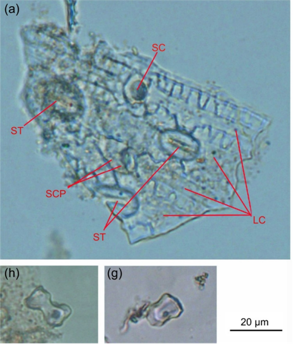 在属于早期鸭嘴龙类恐龙——马鬃龙的牙缝里,科学家找到了植硅体的残留物,证明这种恐龙已经开始进食比较坚硬的植物了。图源:Yan Wu; Hai-Lu You; Xiao-Qiang Li (2017). "Dinosaur-associated Poaceae epidermis and phytoliths from the Early Cretaceous of China". National Science Review. in press. doi:10.1093/nsr/nwx145