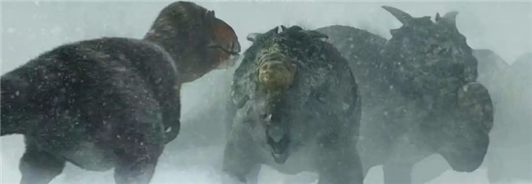 纪录片《史前星球》中白熊龙攻击厚鼻龙的场景,这两种恐龙生活在今天的阿拉斯加地区,在白垩纪时那里依然是冰封之地。图源:纪录片剧照