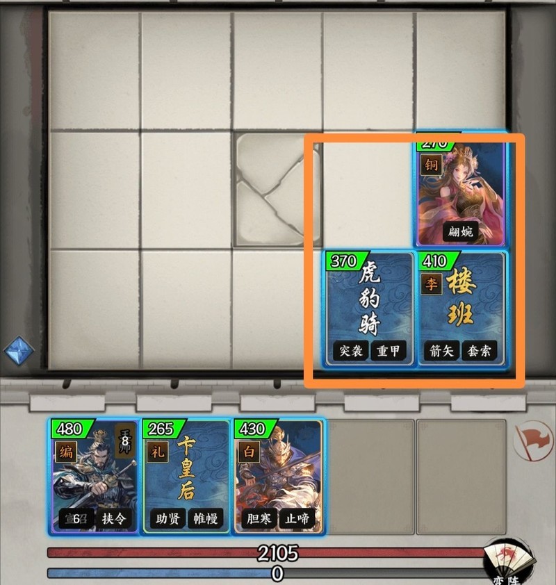 已知楼班与卞皇后位置固定,金貂蝉则用于重置野将。楼班有35%概率出场,若首次未能控制,仍有第二次机会,且可抢先占据位置,使敌方近战无法攻击。卞皇后常与曹操搭配使用,曹操作为主将,其技能可召唤虎豹骑,协助貂蝉将楼班包围,形成压制效果,具体布局所示。