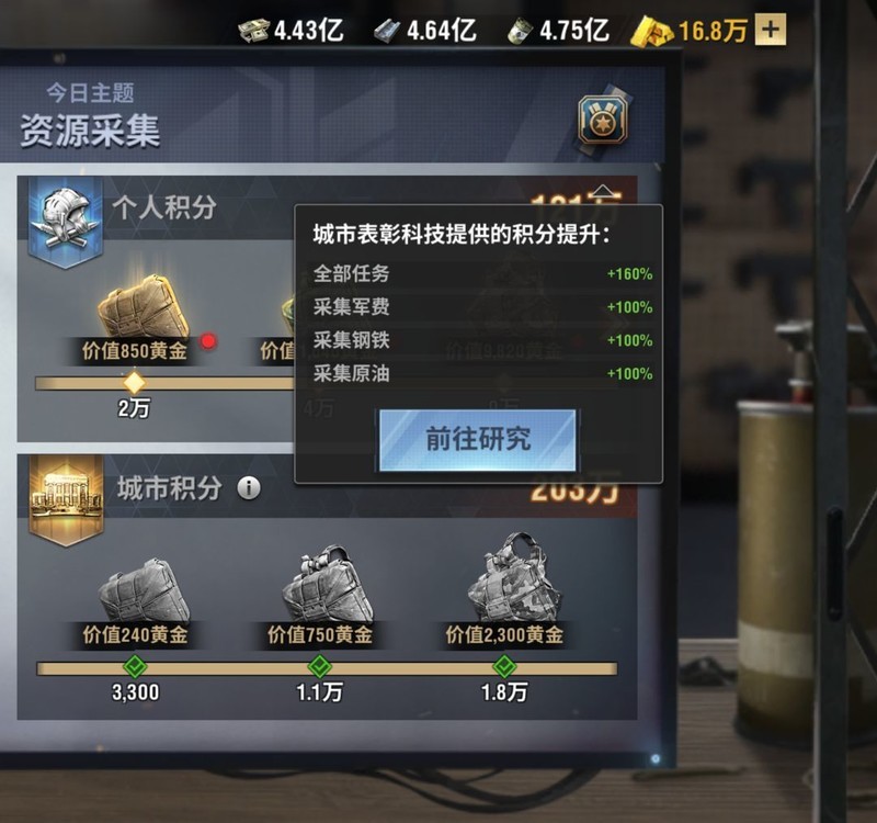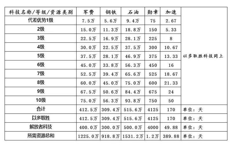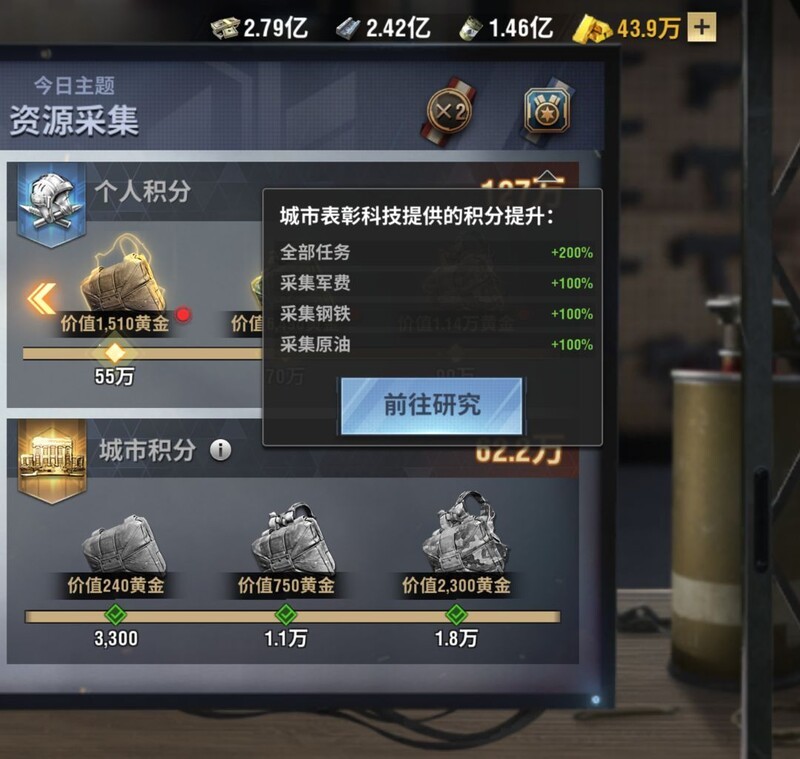 所示,解锁解放者科技后,在每天领取满9级军备资源箱的情况下,可获得7200黄金、600城市贡献勋章以及6个金色军官雕像。