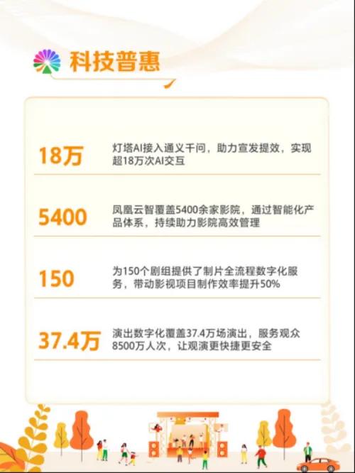 影视制作与观演服务的数字化同样成效显著。凤凰云智已覆盖全国5400余家影院,以智能化工具提升影院管理效率;云尚制片为近150个剧组提供全流程数字化服务,带动剪辑制作效率提升50%,让创作过程更高效;淘麦郎数字化服务则覆盖37.4万场演出,服务观众8500万人次,让观演体验更快捷更安全。