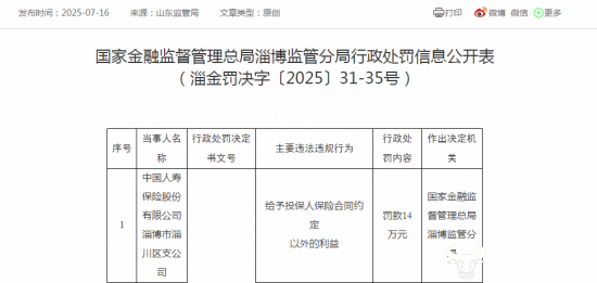 淄川区支公司,因给予投保人保险合同约定以外的利益,被罚款14万元;时任副总经理袁丽丽,被警告并罚款5万元。