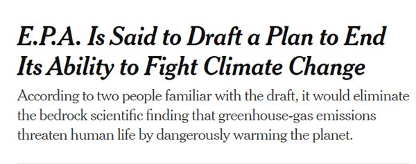 纽约时报最新报道,美国环境保护局(EPA)将宣布排放温室气体对人类无害,将解除车辆、发电厂和其他行业等所有排放限制。