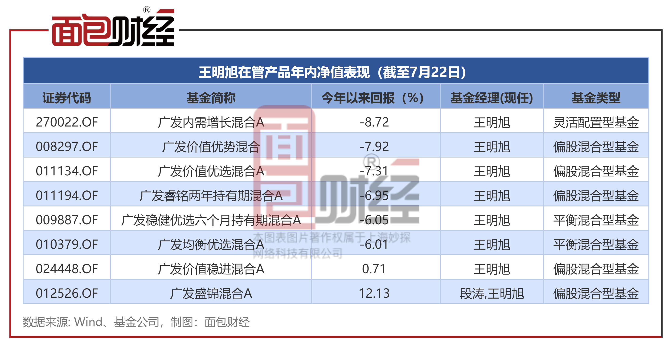 截至2025年7月22日,除了广发盛锦混合A(由段涛,王明旭共同管理)、广发价值稳进混合A(2025年6月新成立),王明旭管理的其他6只产品年内净值均下跌超过6%,跑输业绩基准均超过10个百分点。