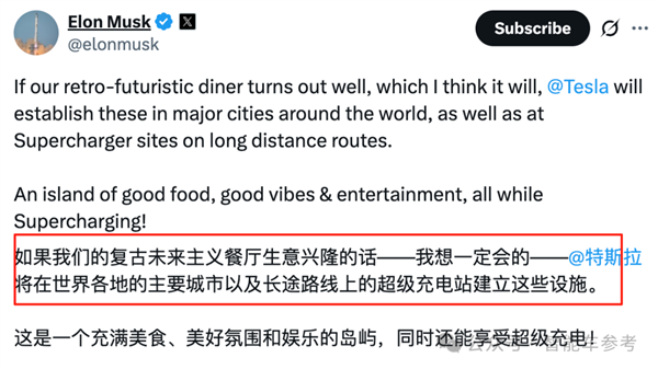 至此,马斯克的超充站餐厅,与余承东的鸿蒙大酒店和李斌的蔚来牛屋,形成「新能源餐饮三巨头」格局。