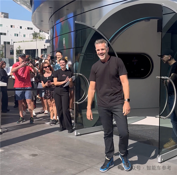 开业当天,马斯克派出设计总监Franz von Holzhausen(图最右)剪彩。可以看到好多人都在等着入内。