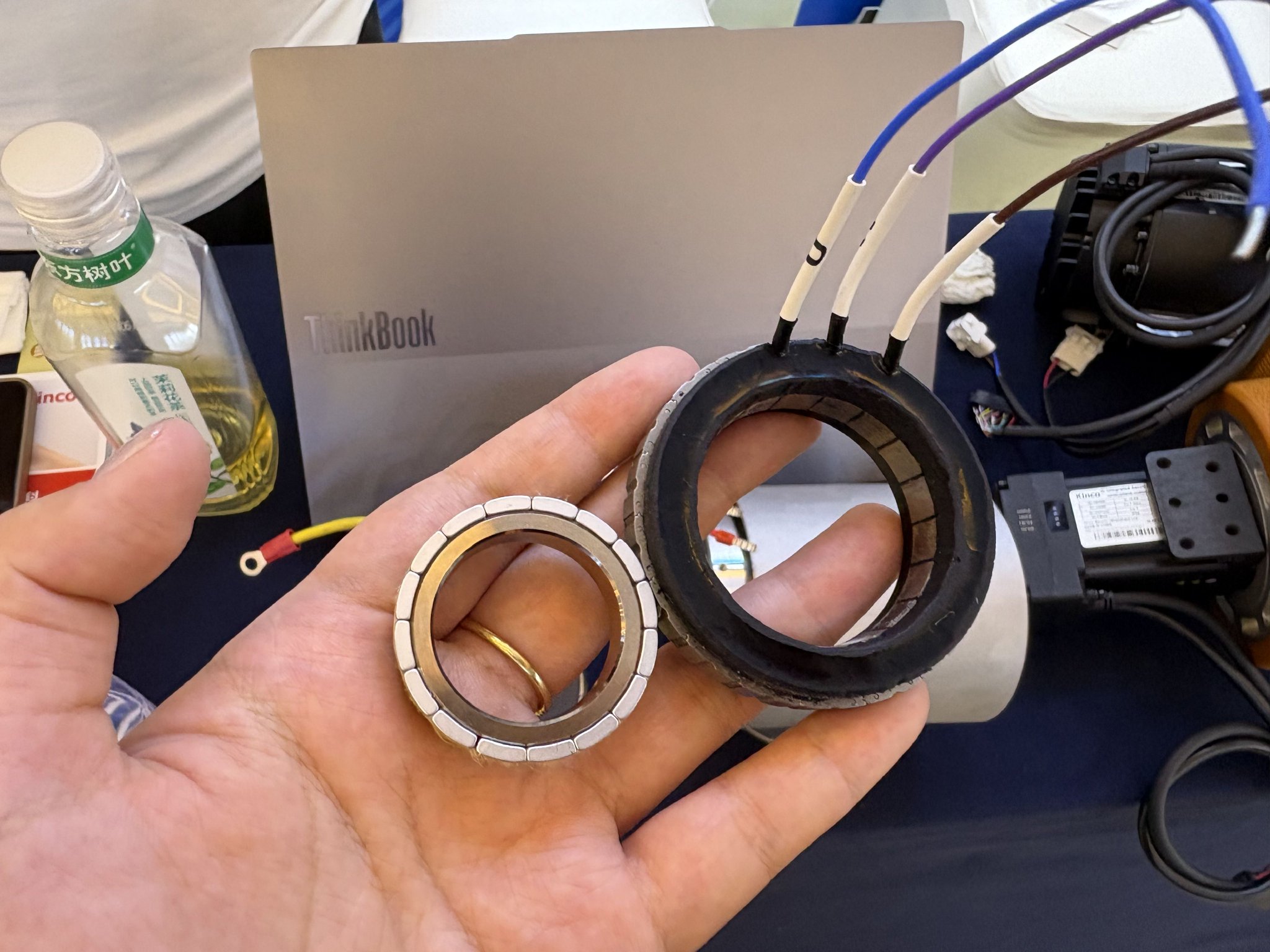 深圳市步科电气有限公司人形机器人行业总监彭泽华告诉第一财经记者,尽管公司已经拥有成熟的工业机器人核心零部件自动化产线,但供给人形机器人的无框力矩电机依然是“手搓”的。“这个银色小磁环外部的贴片就是靠手工贴的。”彭泽华告诉记者。
