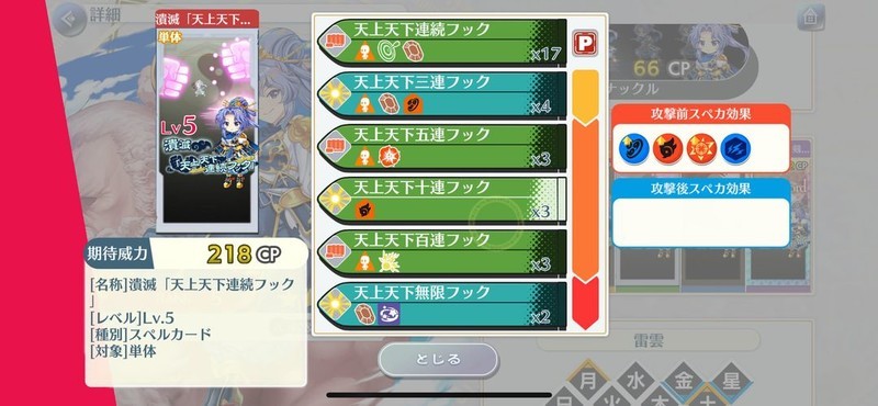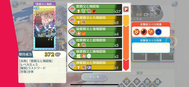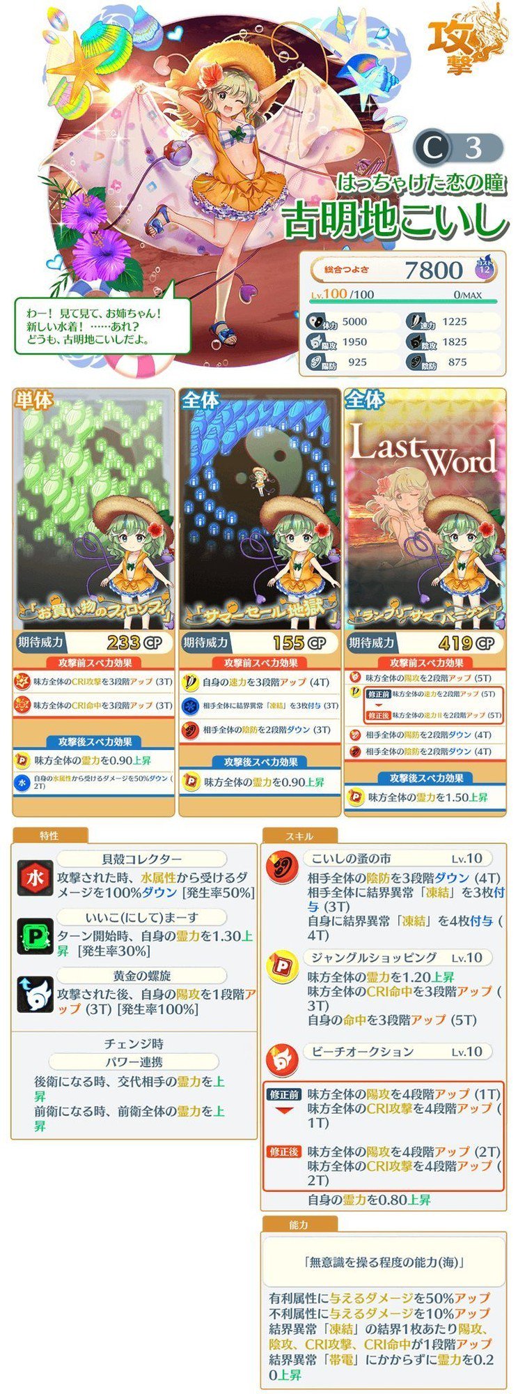 自身暴击攻击五段,全体阴属性攻击四段。