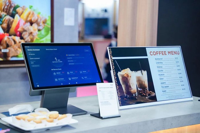 京东方创新打造沉浸式咖啡厅,系统化展示从商品管理到消费者互动的全链路数字化能力。其中,31.5英寸彩色墨水屏数字标牌,在WiFi长连接的情况下,静止画面下突破性实现小于0.05W超低功耗,续航时间长达4个月(搭配7100mAh电池,刷新5次/天),断电持久显示,以零光污染特性重新定义绿色零售空间。电子价签通过双向交互功能构建消费者行为分析中枢,全方位呈现“人、货、场”全场景数字化。