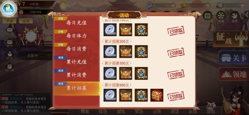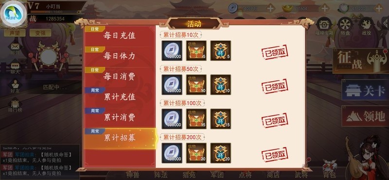 开服前三天有战力和等级榜单,闯关后尽量抽奖获取武将并继续闯关收集抽奖令。三天限时榜单结束后,建议在第4至7天保留抽奖令,因为七天后会有抽奖活动和每日体力活动,奖励较丰厚,建议每周尽量完成全部奖励。