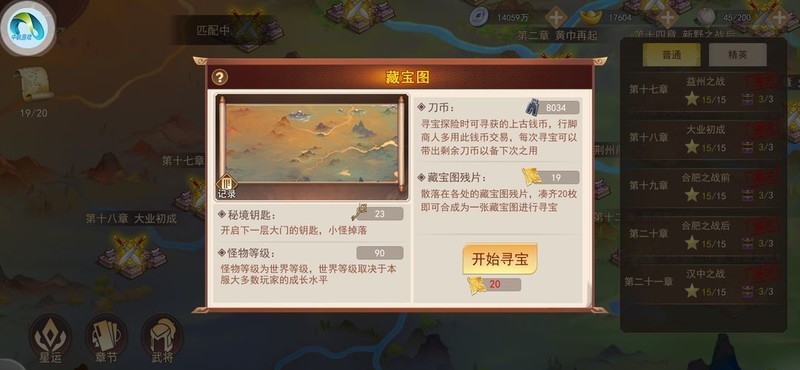 升级过程中,建议前七章的普通关卡先不要扫荡,通关第八章后会开启藏宝图碎片获取。每收集20个碎片可开启一次藏宝图挑战。藏宝图内奖励丰富,但对战力有一定要求,且每层需消耗钥匙进入,共设有五层关卡,其中最珍贵的奖励为玉命签和高级剑丸。