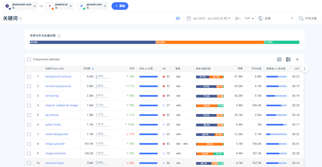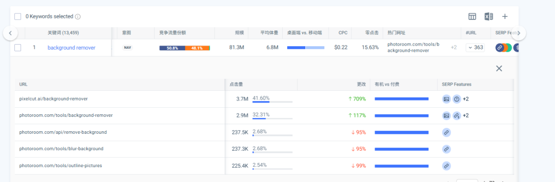 这3 个功能点的相关关键词、其对应的规模,以及2 个头部产品在其中的占位,能够很好地反应出pixelcut为什么能后来居上。
