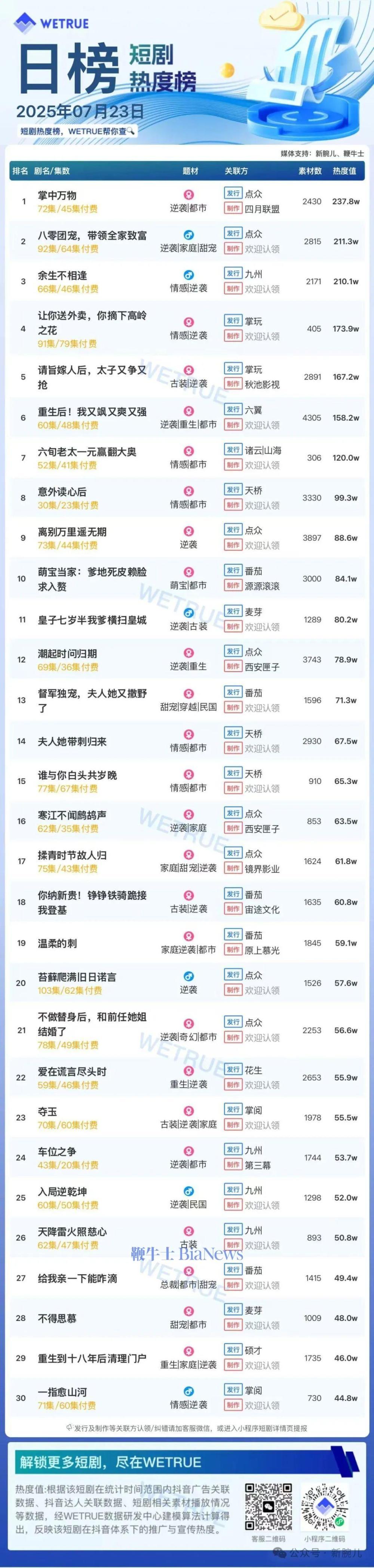1、本日榜为WETRUE短剧数据公司提供,新腕儿和鞭牛士提供联合支持。