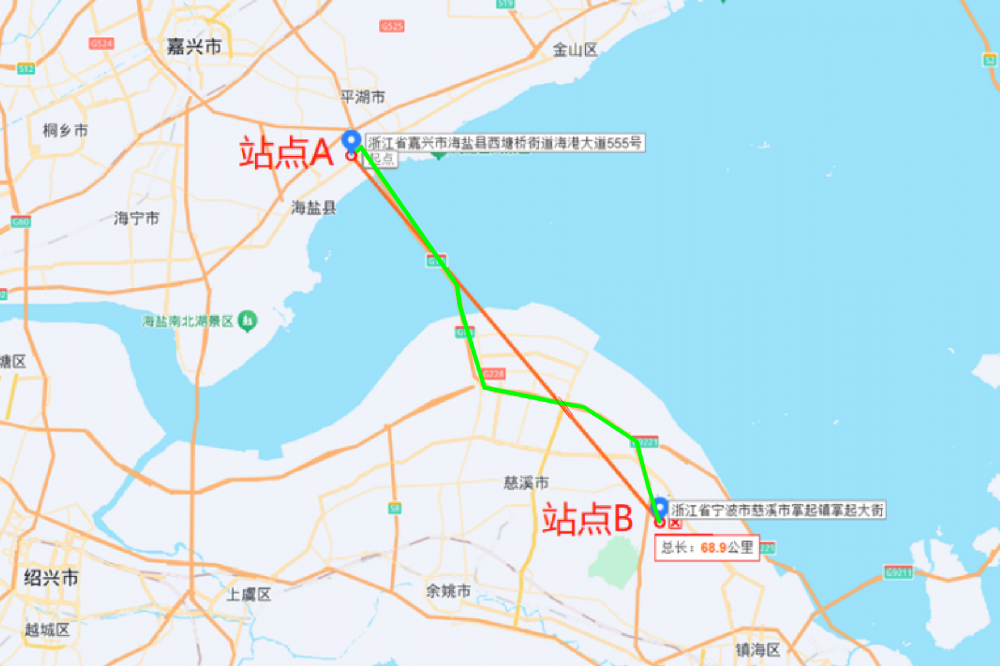 项目选定国家重大交通枢纽——杭州湾作为核心试验场,在杭州湾大桥两端的中国联通嘉兴海盐站点与宁波慈溪站点分别部署试验设备,试点方案如下图所示,其中红色线条代表空间光通信授时链路,绿色线条代表地面光纤授时链路: