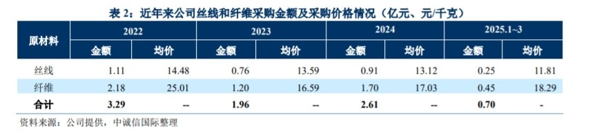 2024年以来,公司原材料中的丝线价格有所下降;但纤维采购价格呈现上升趋势,主要系 PTFE纤维和芳纶纤维等单价高的纤维占比上升所致。