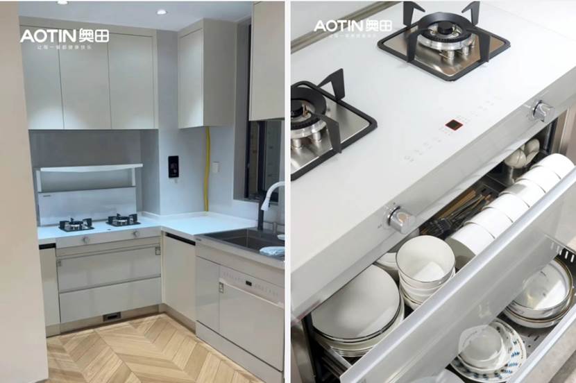 浅木色地板、简洁橱柜构建出温馨日系厨房。奥田智能集成厨电白色外观融入其中,柔和不突兀。奥田集成灶90A1S高效吸烟,多档火力支持适配多样烹饪,下方抽100L大容量保洁柜呵护家庭餐具卫生安全。搭配奥田集成水槽洗碗机Q6,L 型布局让操作动线流畅,洗、切、炒一气呵成,在有限空间里实现高效利用。