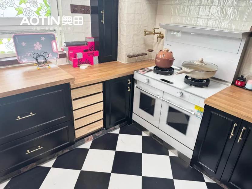 黑白格地砖搭配木质台面、黑色橱柜,复古韵味扑面而来。奥田集成灶WZKD3S-SD白色外观,与整体复古基调和谐相融。精准的火力控制、高效的吸油烟效果,全能的智能蒸烤满足多元烹饪需求。上方置物区可随手放置常用调料,让复古厨房在颜值在线的同时,烹饪效率拉满。