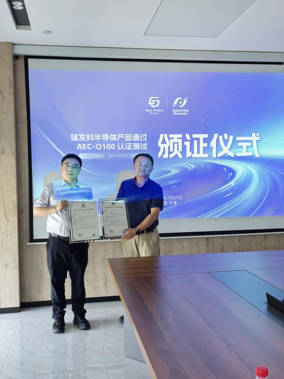 2025年7月21日,天津瑞发科半导体技术有限公司(以下简称“瑞发科”)的HSMT车载SerDes屏显芯片组NS6129S和NS6168两款产品,在季丰电子可靠性实验室的助力下,成功通过AEC-Q100认证测试,并荣获AEC-Q100认证证书。瑞发科联合创始人兼副总裁王立新先生及季丰电子执行副总裁倪卫华先生等双方重要嘉宾参加本次颁奖仪式。